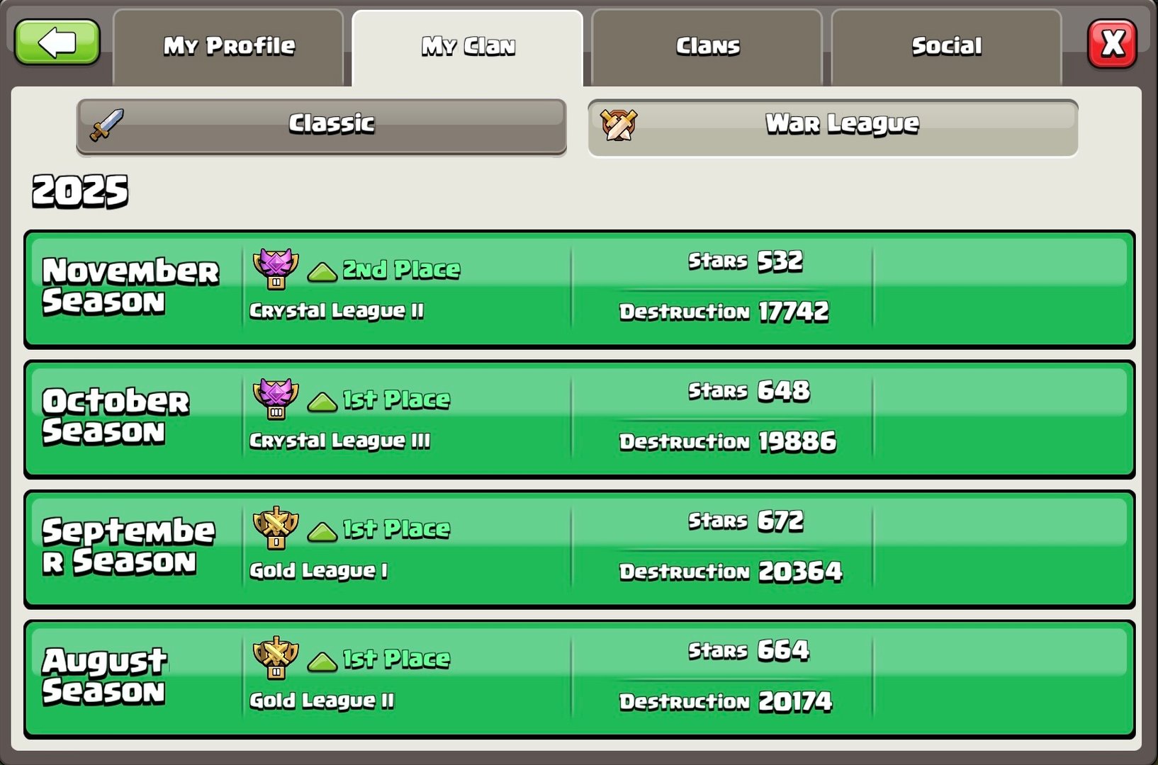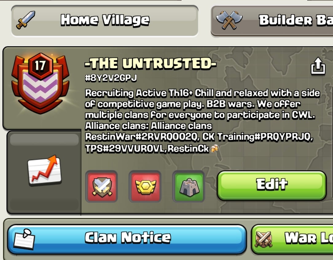 We looking for active players to join our clan! Were competitive, we respectful, and were building a great team! Help me Rebuild a abandoned clan. Back To Back War (Have Discord Server) Please be Active, Attack in war and Clan Raids, Etc. If you do not want to be in war just simply change your preferences. Promotions are earned by donating and attacks in war. anyone inactive for 5+ days w/o notice will be kicked
