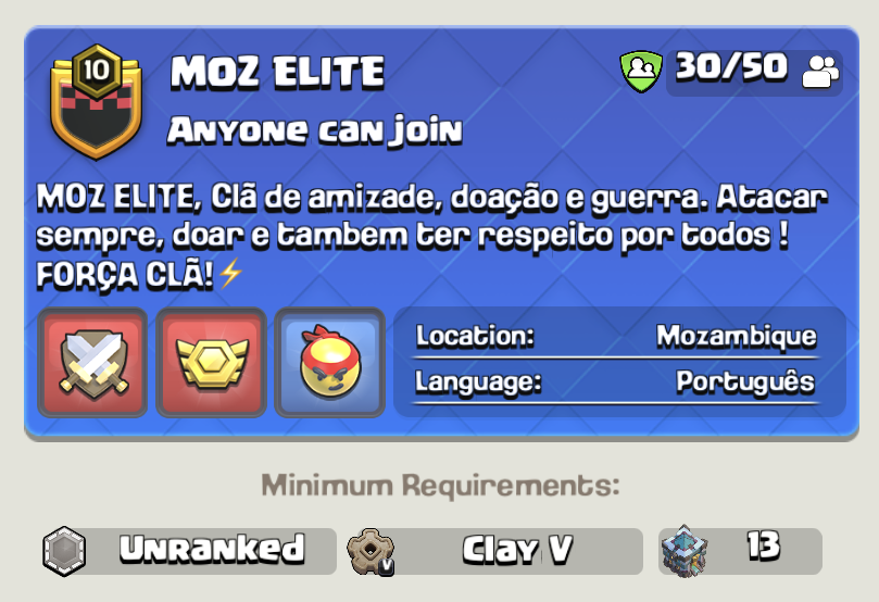We are a friendly & active group of mostly adult players. Excellent donations, back to back wars, max Clan Games rewards, max Capital Raid medals and constant support. Must be active to participate in War. People who communicate are preferred for war. Complete Raid Weekends & a minimum of 1,000 points in Clan Games.